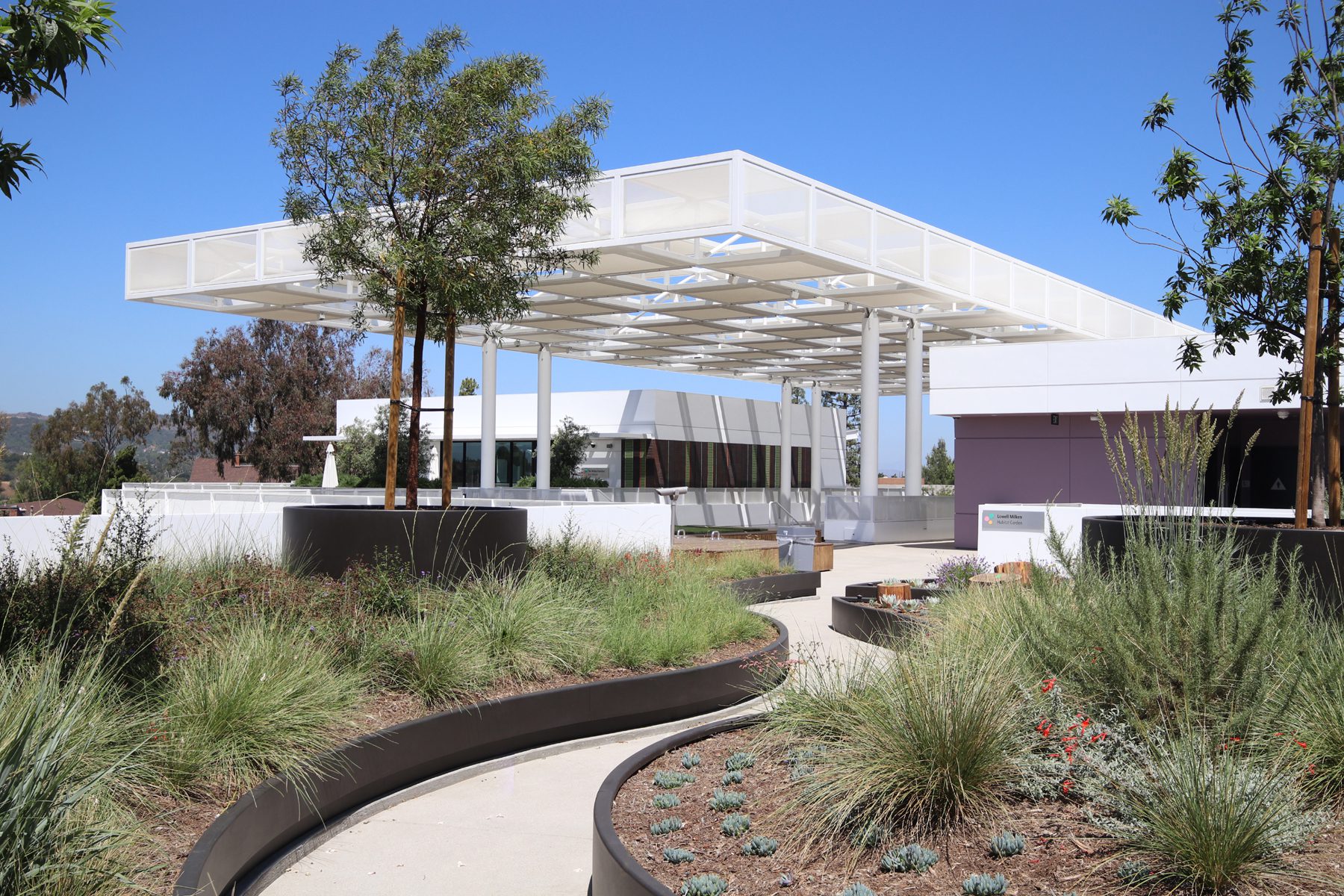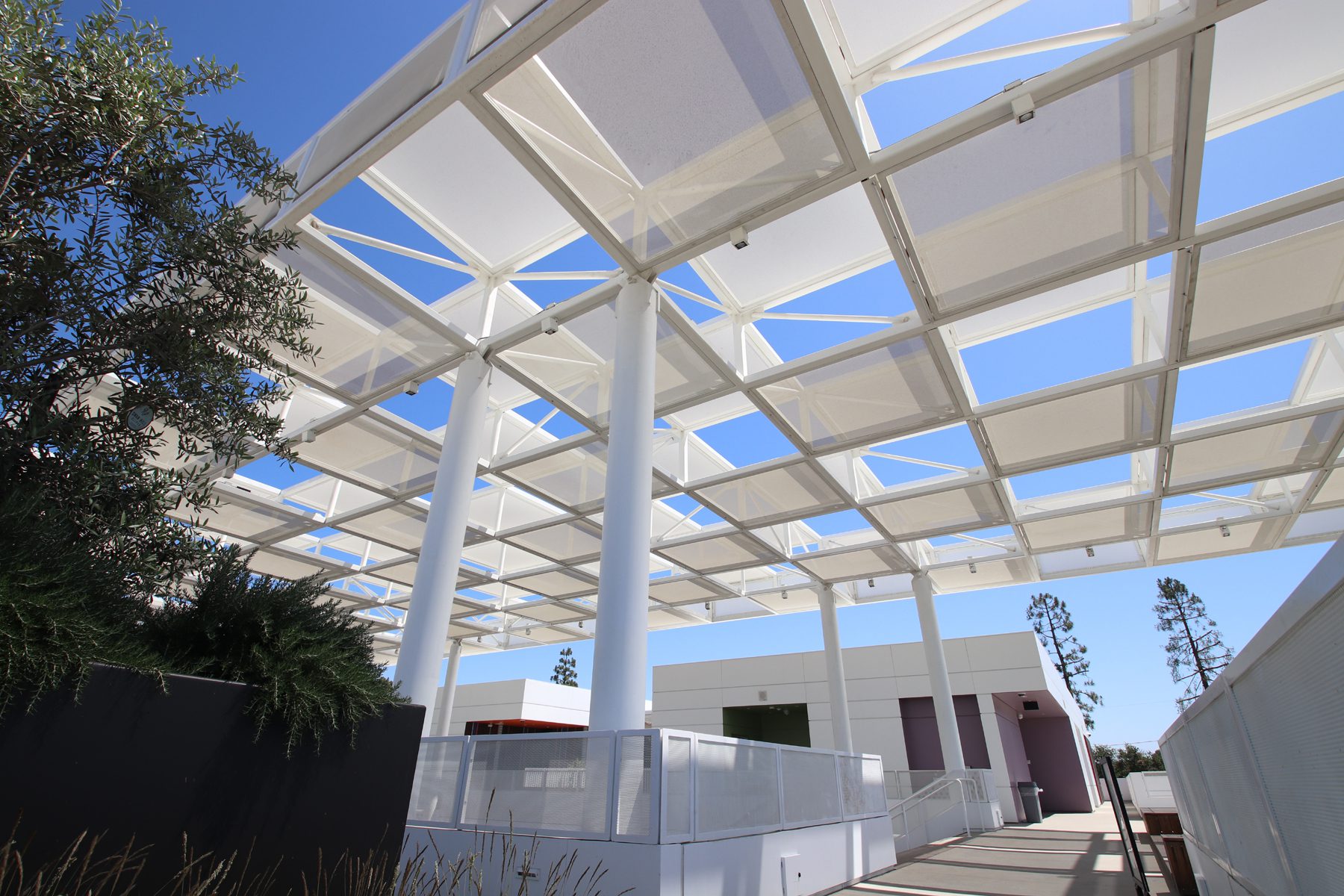 Eide Industries, Inc. was contracted by Trussworks International to furnish custom fabric panels as part of the exterior facade for a large canopy located in the main courtyard of the Aaron Milken Center in Los Angeles. The main freestanding canopy, built by Trussworks International, measures 128'-0" long x 56'-0" wide x 34'-6" high, and is engineered to withstand wind loads up to 110 MPH.