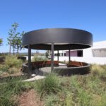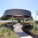 Eide Industries was tasked with the design-refinement, engineering, and installation of the 20-foot diameter circular trellis standing 9 feet 6 inches tall. The shade structure features a tensioned mesh top cover, fabricated using flame-retardant White Serge Ferrari FT 381 Precontraint fabric. Engineered for 110 MPH wind loads, the canopy delivers is a sound structure with architectural elegance. The trellis exterior is finished with powder-coated metal cladding, installed by others, enhancing its weather resistance and visual appeal. The rounded steel frame includes integrated supports for a circular bench finished with wood cladding by others complimenting the natural garden.