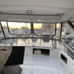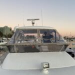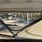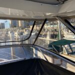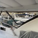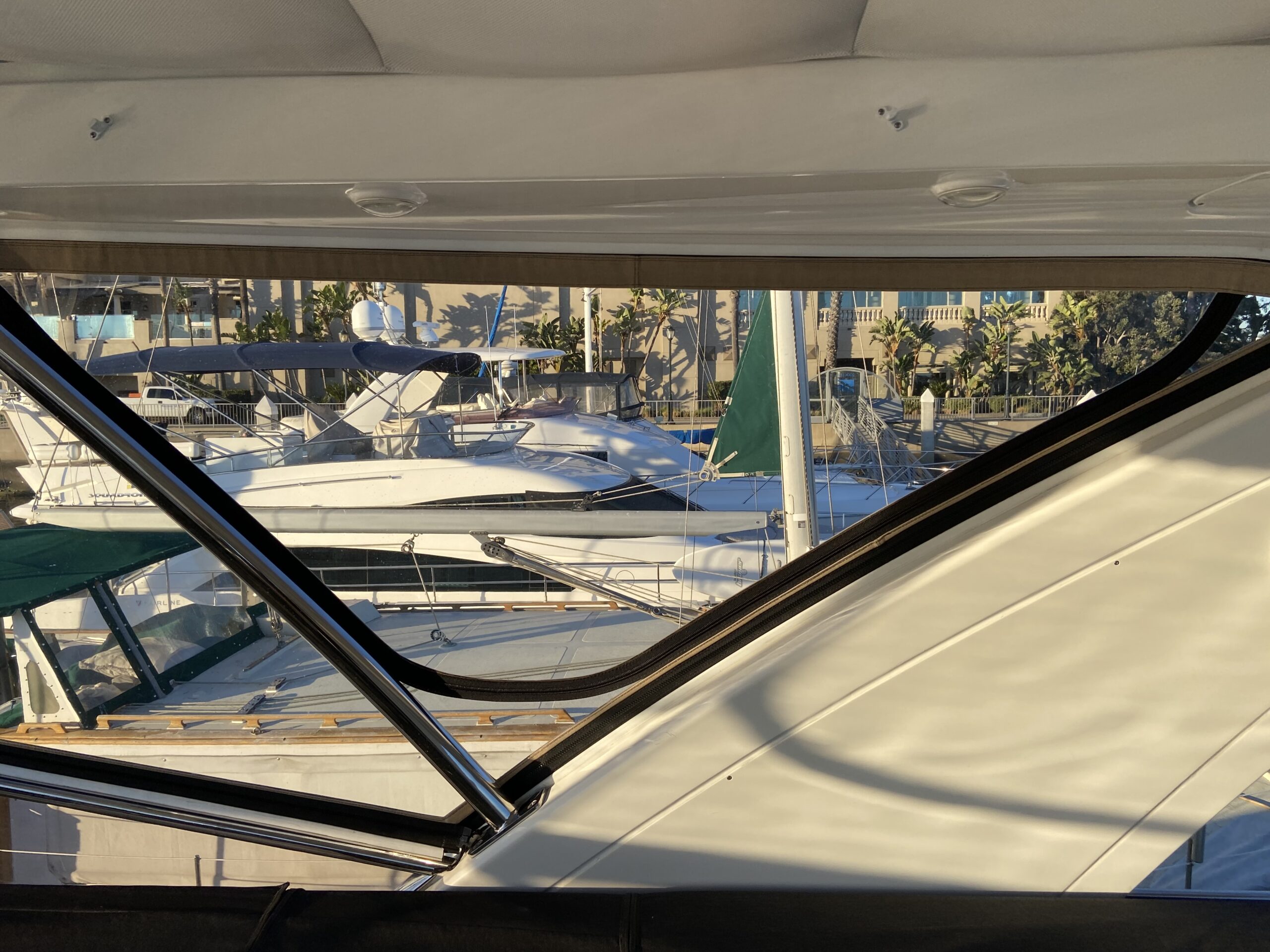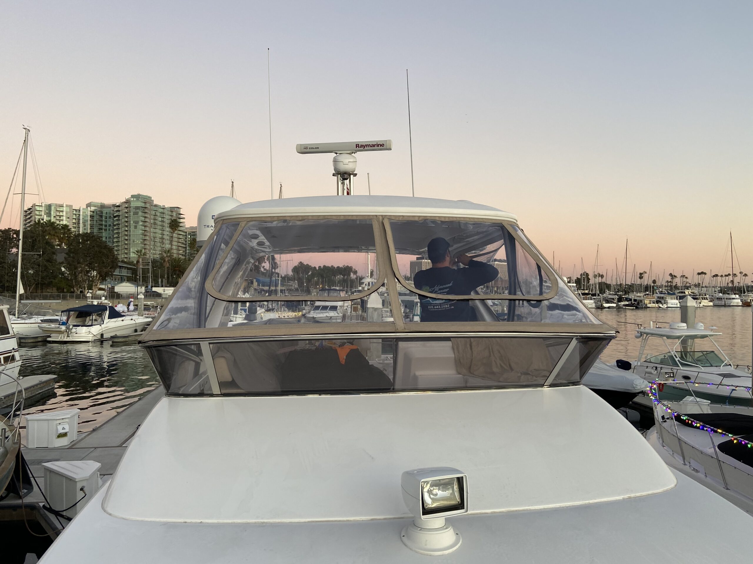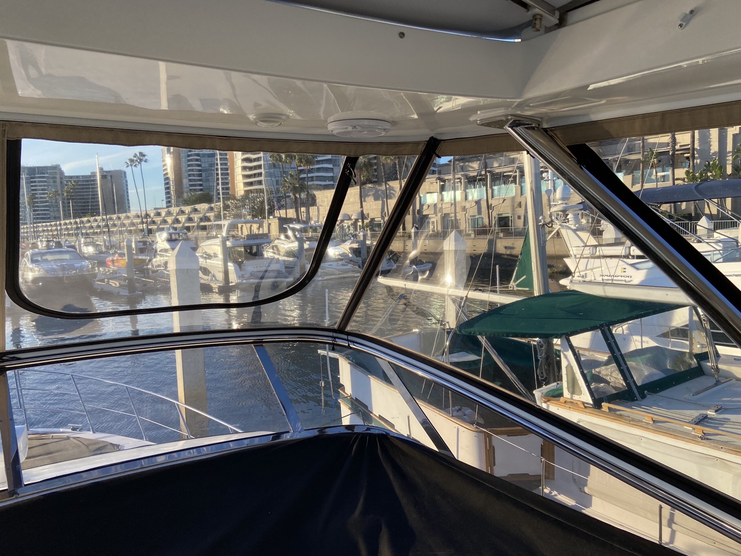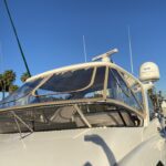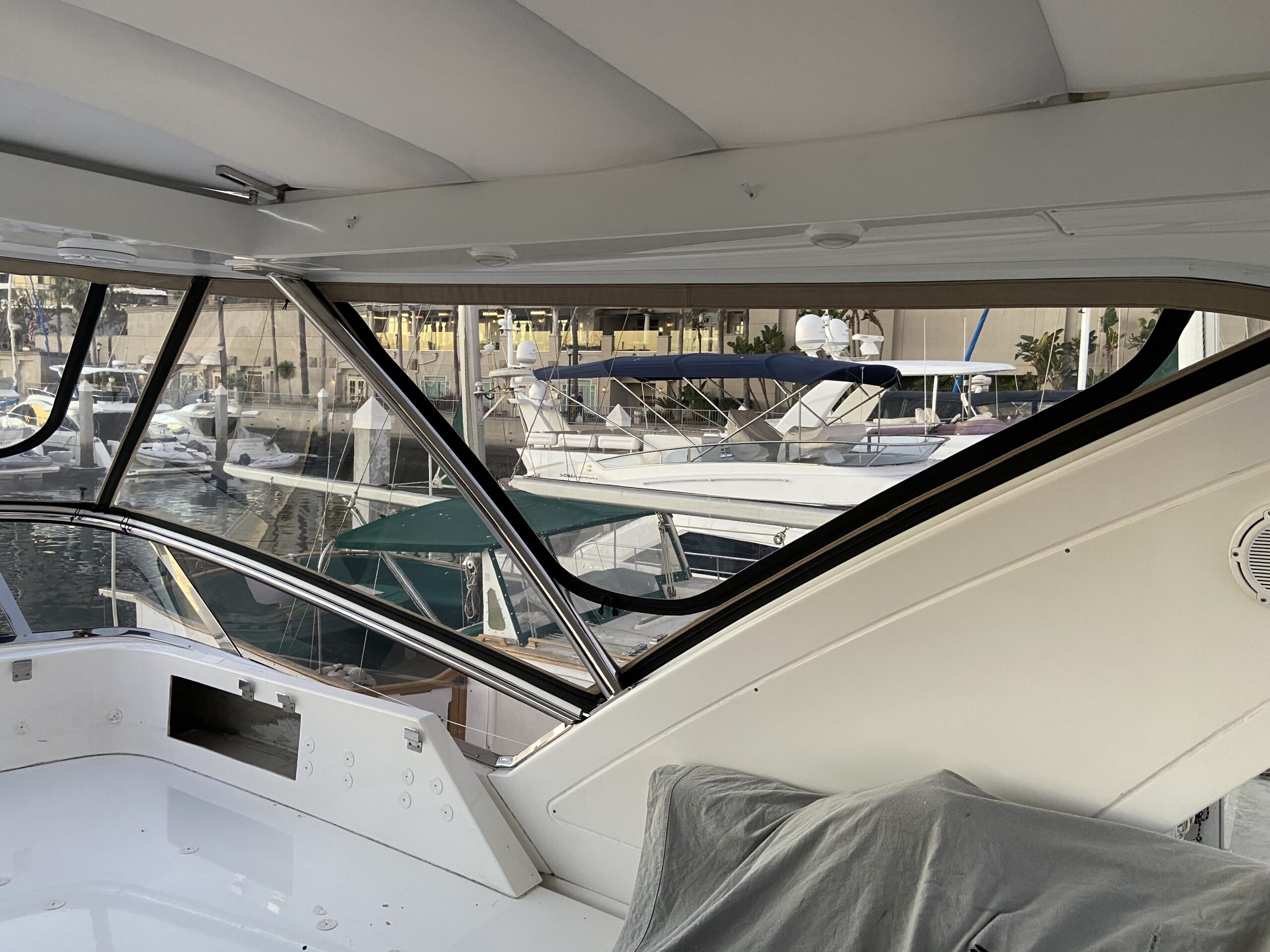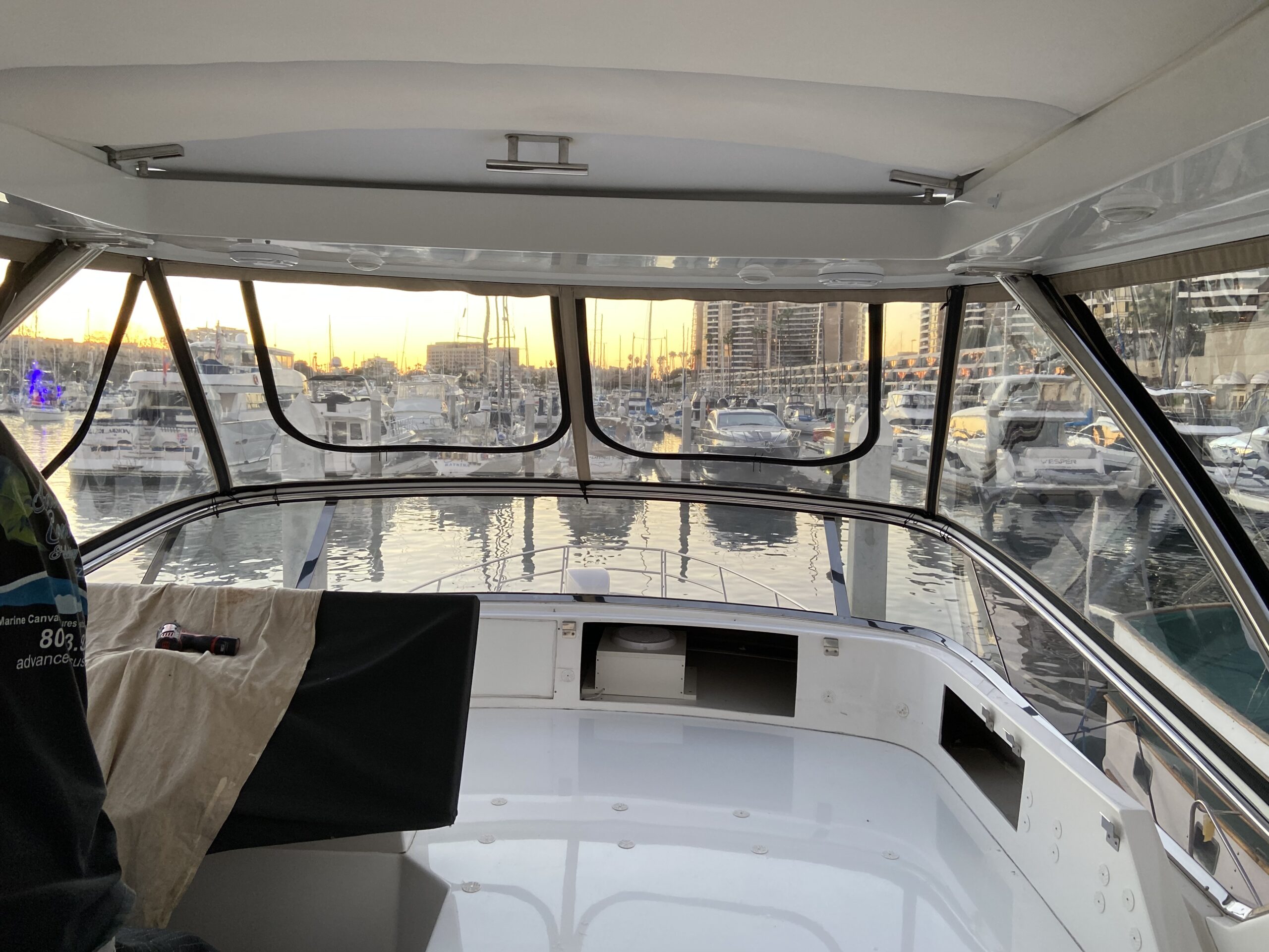 Customer wanted an enclosure with operable windows everywhere. Honestly this boat belongs in warm climate without an enclosure . Then of course I get to work for one of the top 5 lawyers in Los Angeles and he picks Tresco Linen canvas. Next time patterned canvas is “Not available”. We had to run new track top and bottom and build a little stainless bracket for the bottom center of the Venturi to support the Venturi and enclosure. He wanted the vertical parts of the front window to not be in front of his line of site when driving even though he had a captain and he wanted a small drivers window on side panel for parking.