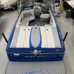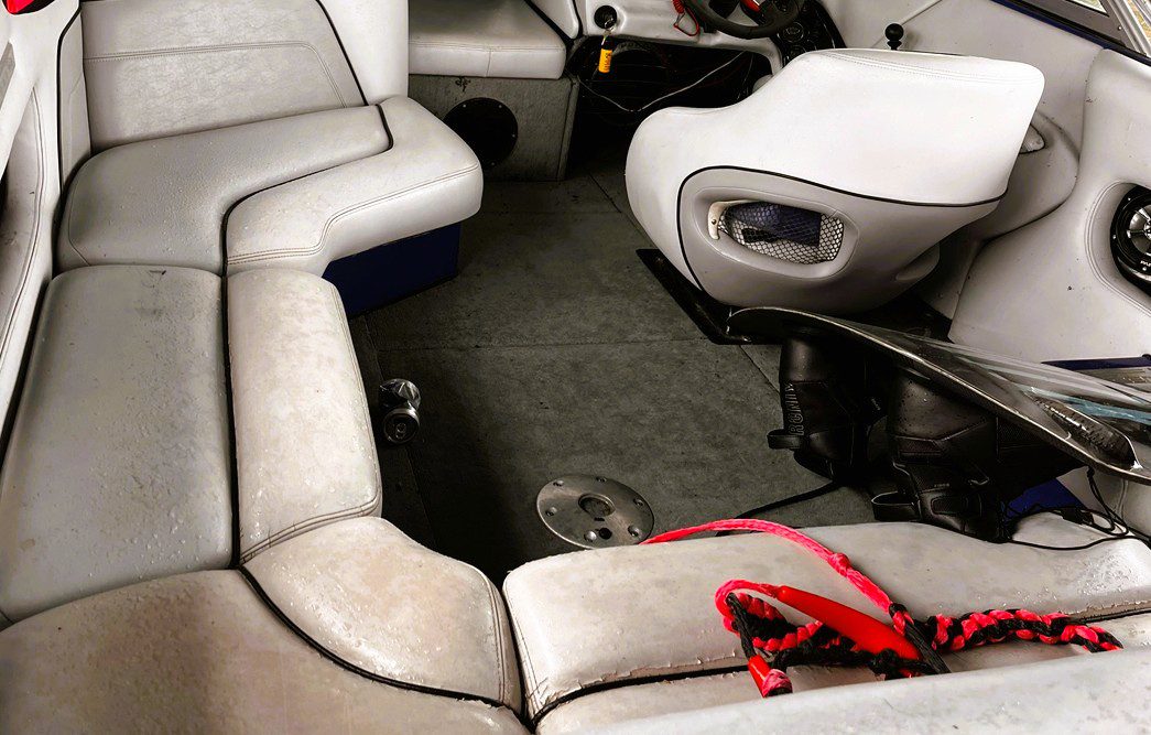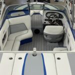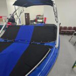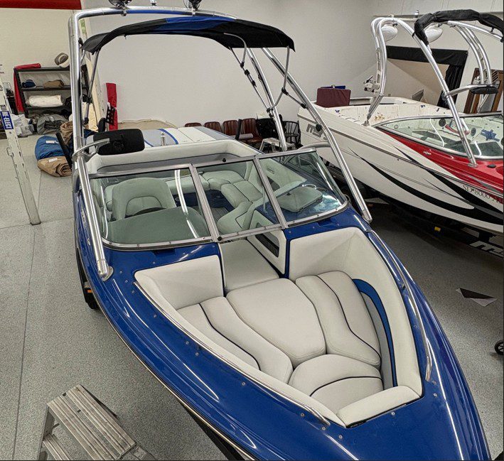 A Legacy Reimagined: The Complete Transformation of “Blue Wave”. After years of towing family and friends across the lake, a 2008 Supreme V208 ski boat affectionately known as Blue Wave was ready for a new life. The owners turned to our team for a complete transformation — a project that would not only restore the boat’s beauty and function but also celebrate cherished family memories. From Worn to Wow. The first step was removing the old, worn-out carpet that had seen countless summers. In its place, we installed sleek Anchor Grey over Blue DEKit EVA foam flooring across the swim deck, cockpit, and bow — a modern upgrade that’s as stylish as it is comfortable underfoot. The new flooring clean lines and durability gave the entire deck a refreshed, contemporary feel. Next came a fully reskinned bimini top with a new matching boot, as well as a complete interior overhaul. We rebuilt seat bottoms, constructed a new speaker box, and even recovered the dash to create a seamless look throughout. Every detail was designed with both performance and aesthetics in mind. The heart of this project lay in one deeply meaningful design element. The client’s daughter created a custom logo to be engraved into the new Dekit swim deck, inspired by a photo of their late son slalom skiing. Incorporating that image alongside the boat’s family name, Blue Wave, turned the restoration into a tribute — a lasting symbol of the family’s love for the water and the memories made there. To complete the transformation, we fabricated a new Sunbrella cockpit cover that extended over the swim deck. A blue stripe was added to tie in the Blue Wave theme, echoing the design across the bimini and boot — subtle details that tied everything together beautifully. When the project was complete, Blue Wave looked and felt brand new. The refreshed interior, custom details, and flawless finish gave the family a boat that’s ready to create new memories for generations to come. The client was amazed by the craftsmanship, attention to detail, and the way every element came together to tell their story.