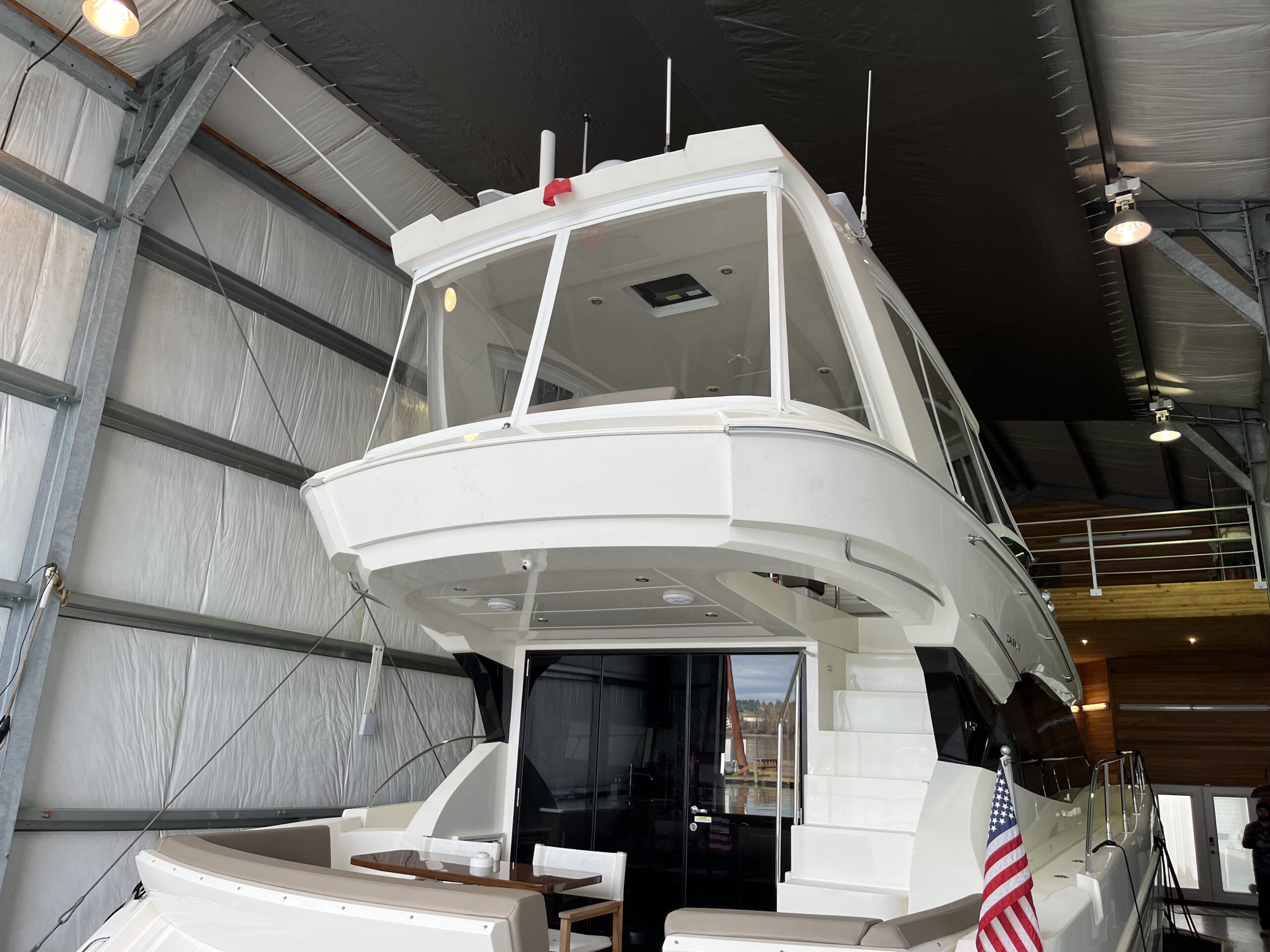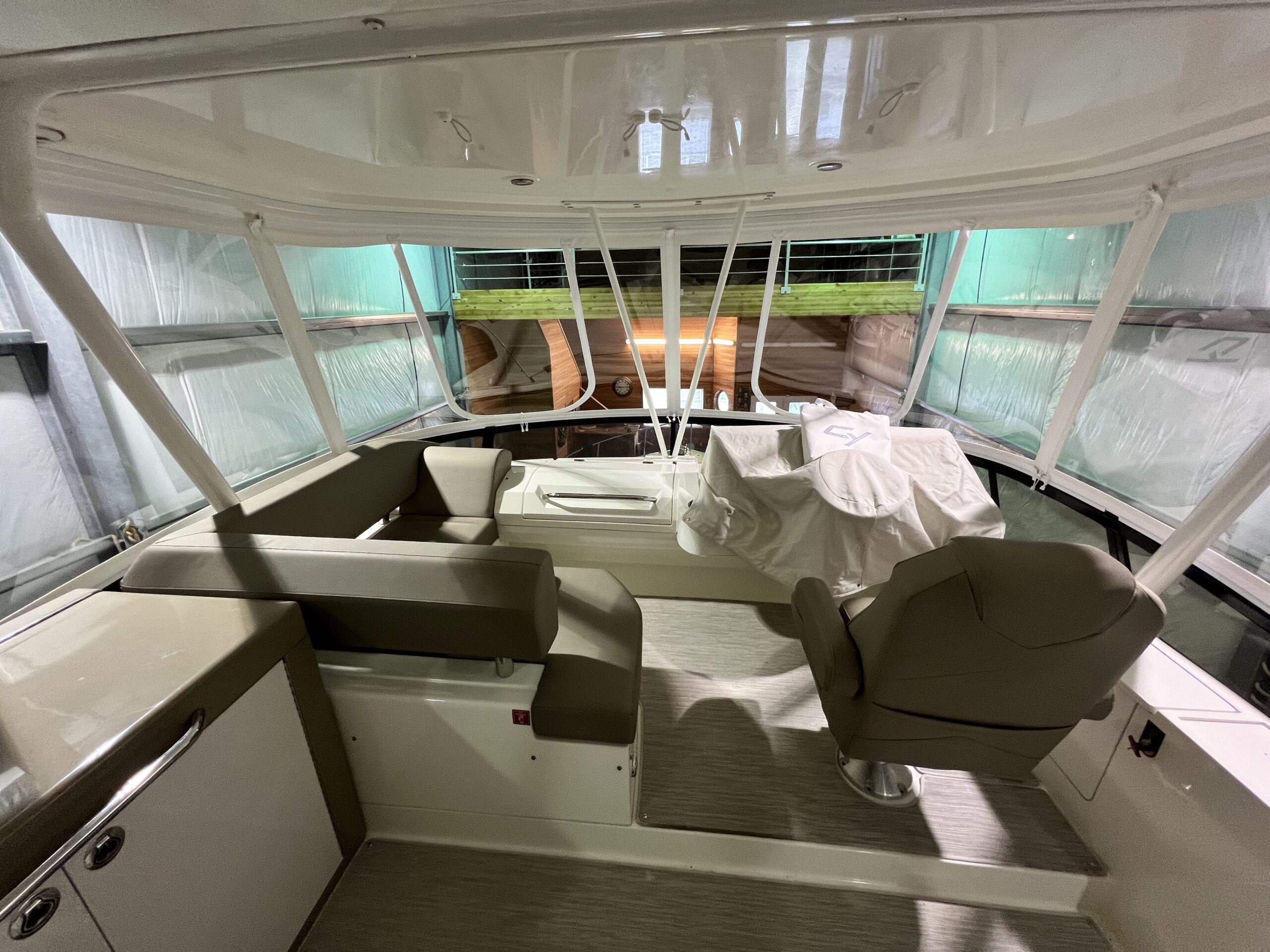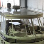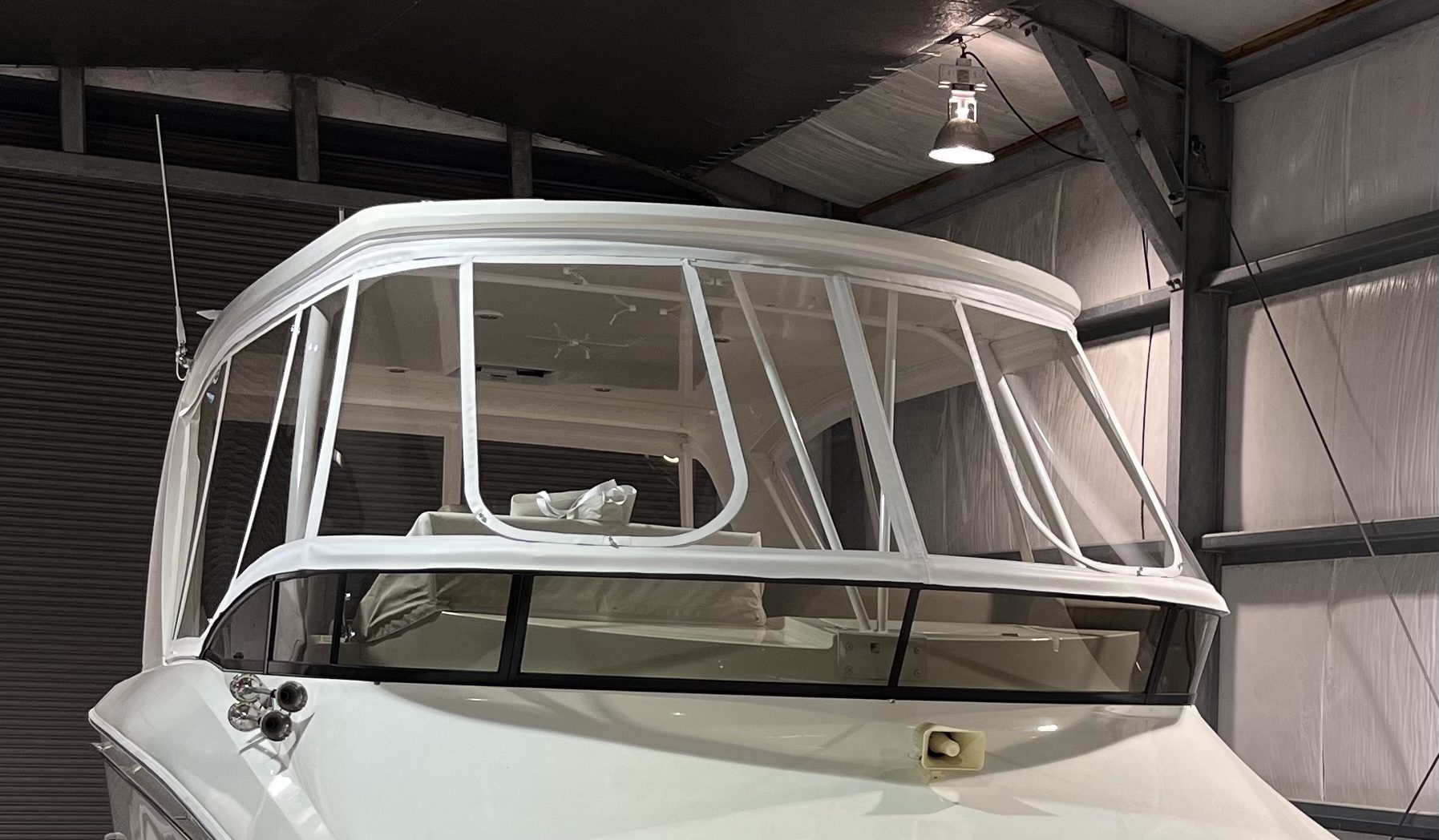 The client requested a clean looking rigid enclosure that looked minimally intrusive on the bridge of this Carver C52 for year round boat use. They also wanted an easy to clean and strong long lasting white fabric. The client wanted a 2 panel layout at the front, seeing as this is a side helm boat. The client also requested easy ventilation/opening of the front and side panels.