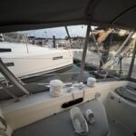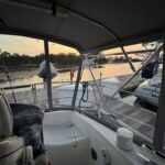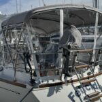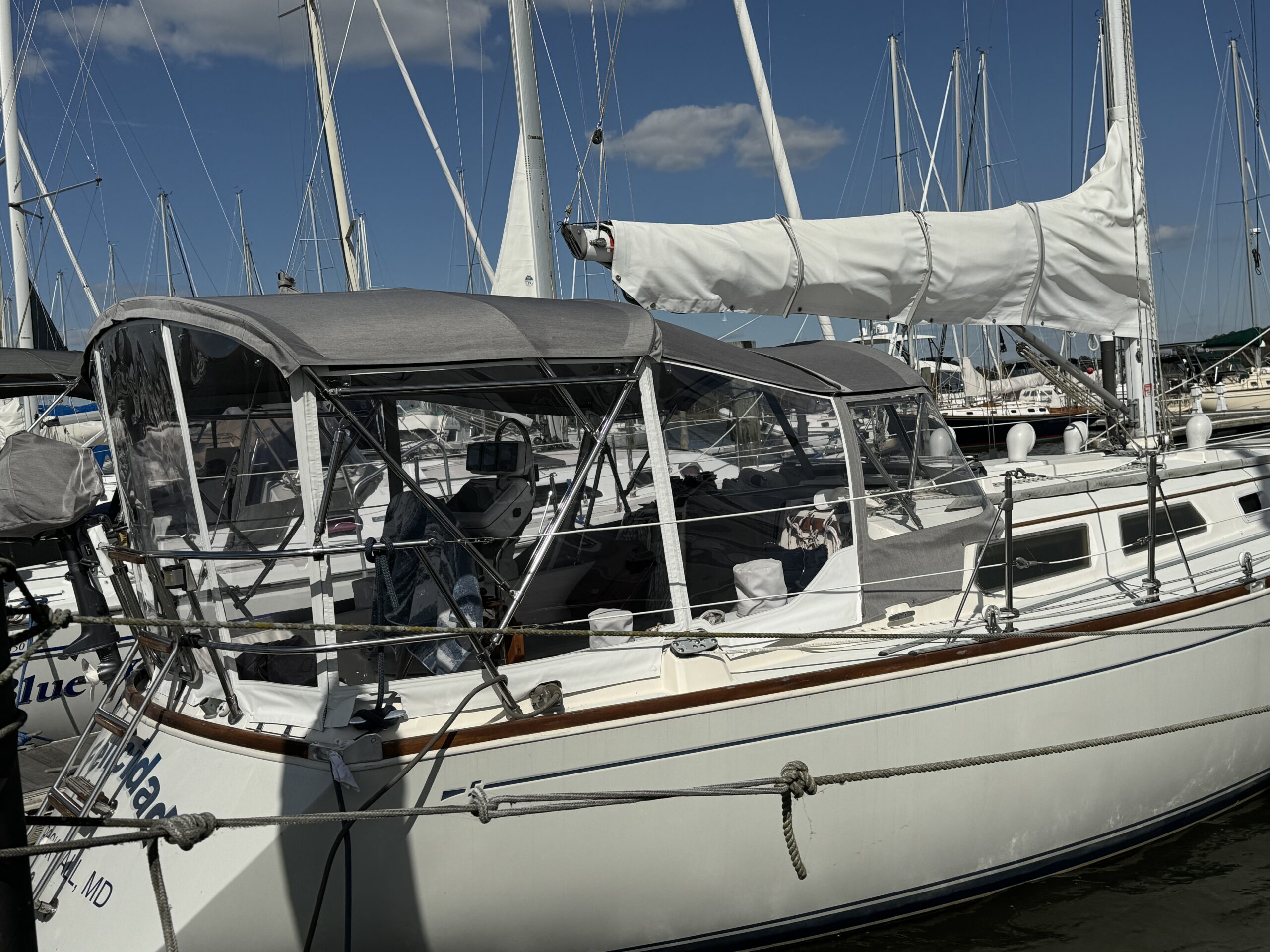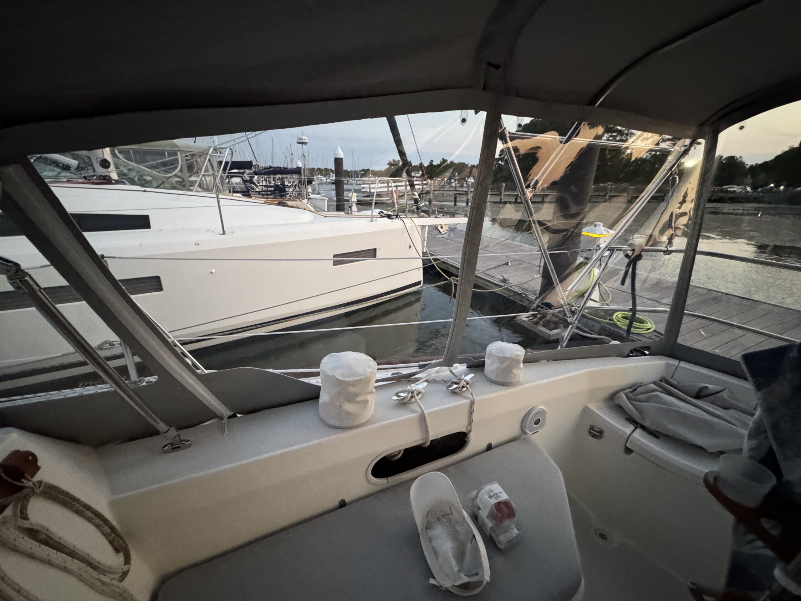 This seven piece cockpit enclosure was designed to add additional cooler weather comfort for both early spring and late fall. The challenge of the project was to provide a enclosure for this 1988 Sabre 36 classic (small cockpit compared to modern boats) without adding the heaviness and bulkiness of an enclosure. To accomplish this, a contrasting white fabric was used to lighten up the enclosure and seamlessly blend in or disspear as best as possible. Narrow vertical panel facing was incorporated as well as to provide maximum viewing area as well. In the interior you will find clean finishes of masked vertical and horizontal zippers and elimination of corner gaps.