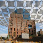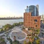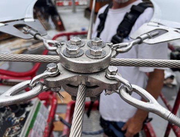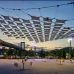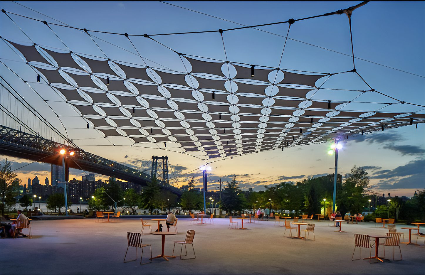 Two Trees Development was building new housing and renovating the old Domino Sugar Factory into offices and an event space in Brooklyn NY. Using James Corner Field Operations as the landscape architect, the open site called Domino Square consisted of an oval hardscape space with surrounded plantings for summer music & film events and winter ice skating. We were asked to develop a seasonal shade system that in the winter would provide lighting for the skating ring. We came up with two different approaches, one a suspended ring with a cable net and demountable shade elements and the other more minimal cable net supported by three tensile structure masts. The Owner chose the second approach, and we developed a 6' wide cable net grid with a free form edge that supported mesh shade elements. The column structure consisted of painted steel. The cable net, and all the clamp plates including miscellaneous hardware were machined stainless-steel from Italy. We designed shade panels to be removed by one lift platform with 2 men, and the fabric panels are stored in custom boxes for the winter months adjacent to the site. The structure was used in the fall and set up again this spring and it creates both a public space and provides shade for the community on the waterfront of Williamsburg, Brooklyn. The custom designed stainless plates and fittings are all permanent and support winter lighting for the ice-skating ring.