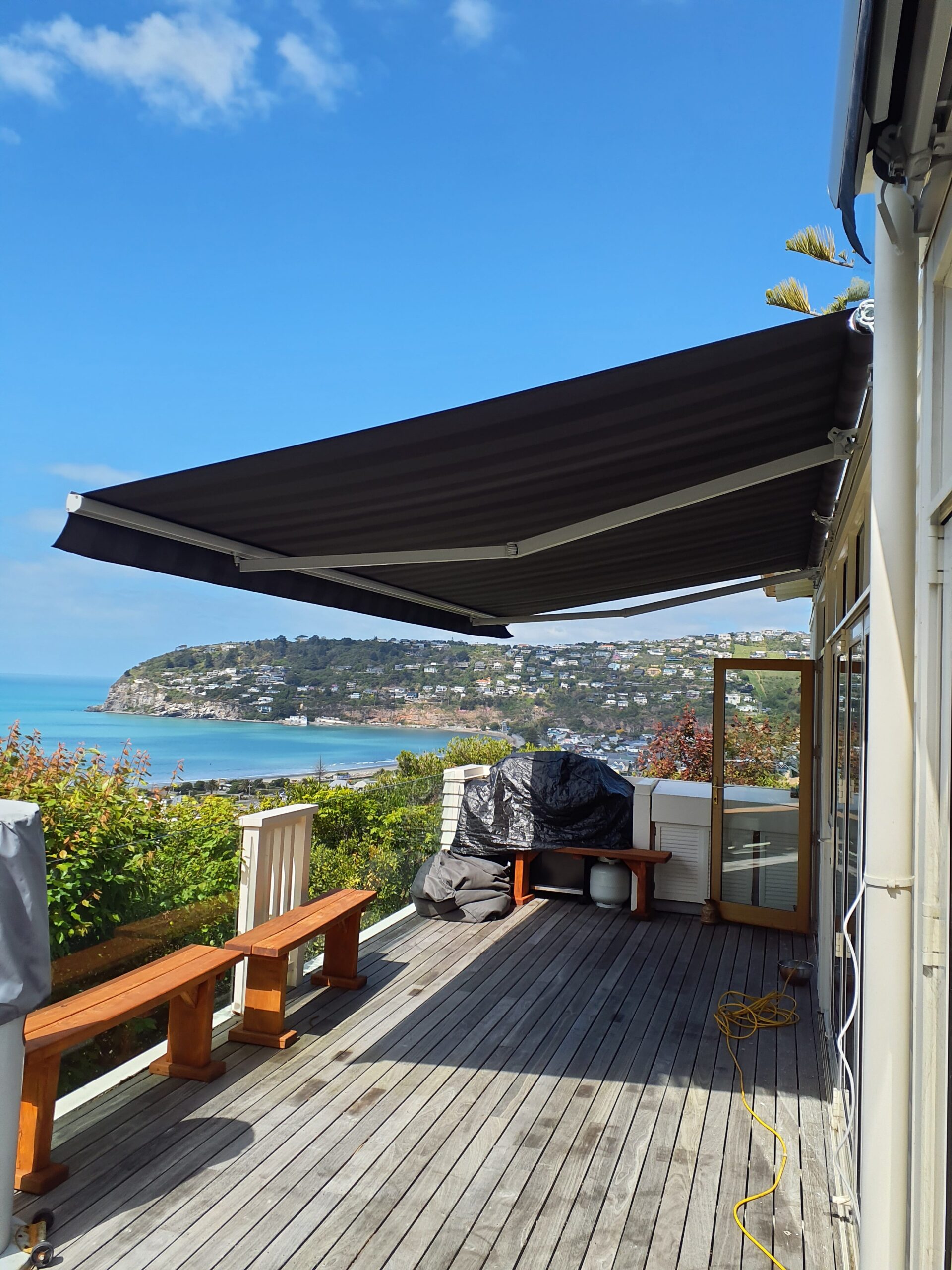 This project involved replacing two seized awnings on a stunning clifftop property with breathtaking ocean views. The location presented significant logistical challenges, access was via a steep path, through the house, and out onto the deck. Our team carefully removed the old awnings and installed new, motorised retractable units featuring Planosol canvas. The result is seamless, functional shade that enhances the outdoor living space while maintaining the home’s spectacular coastal outlook.