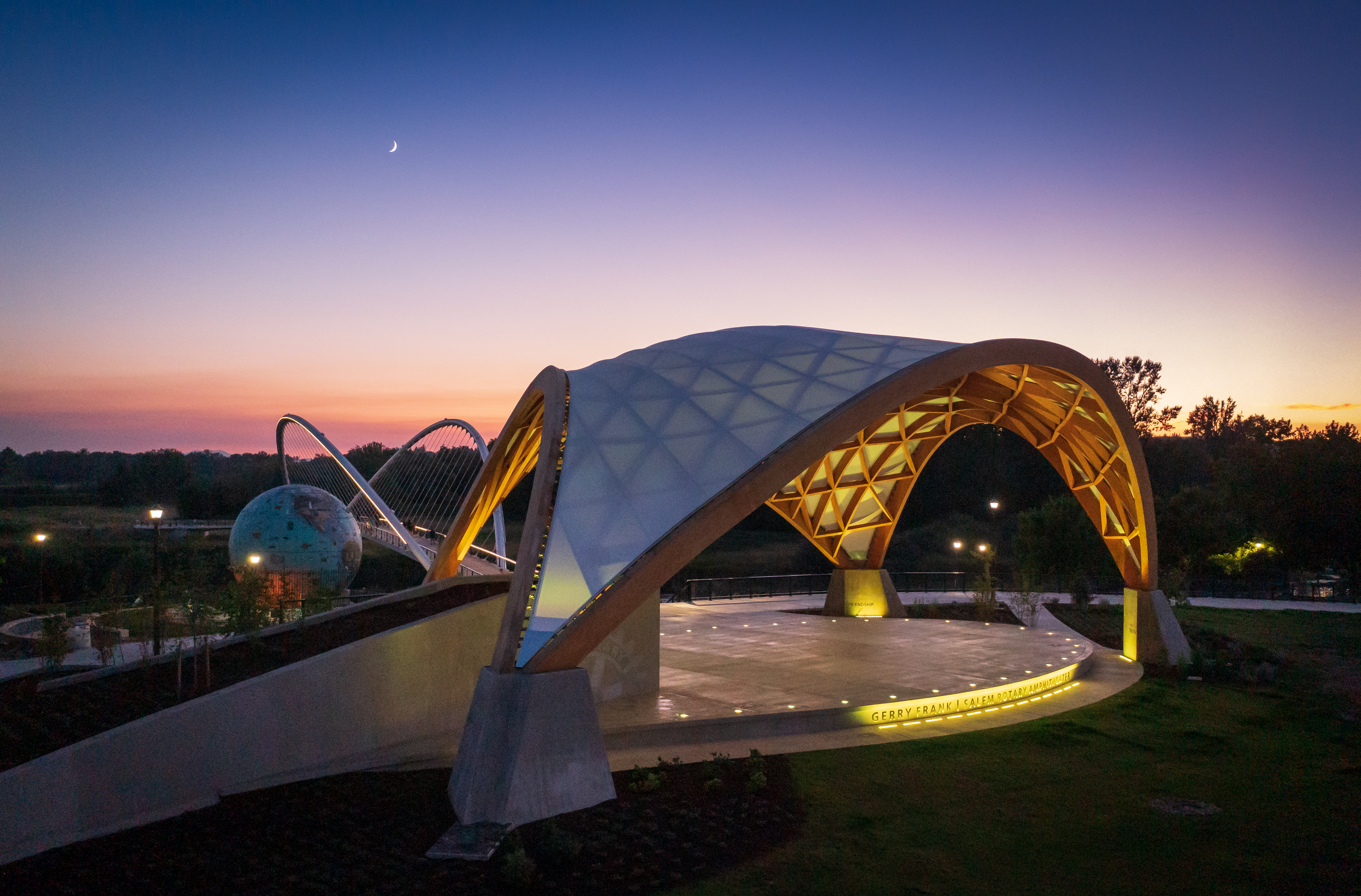 We were brought on early in the design process to provide expertise on structural options and help shape the design. The intricate amphitheater cover incorporates a woven system made of individual segments of glued laminated wood that support a PTFE canopy. Together, this creates a striking visual presence that also creates an emotional connection with the community.