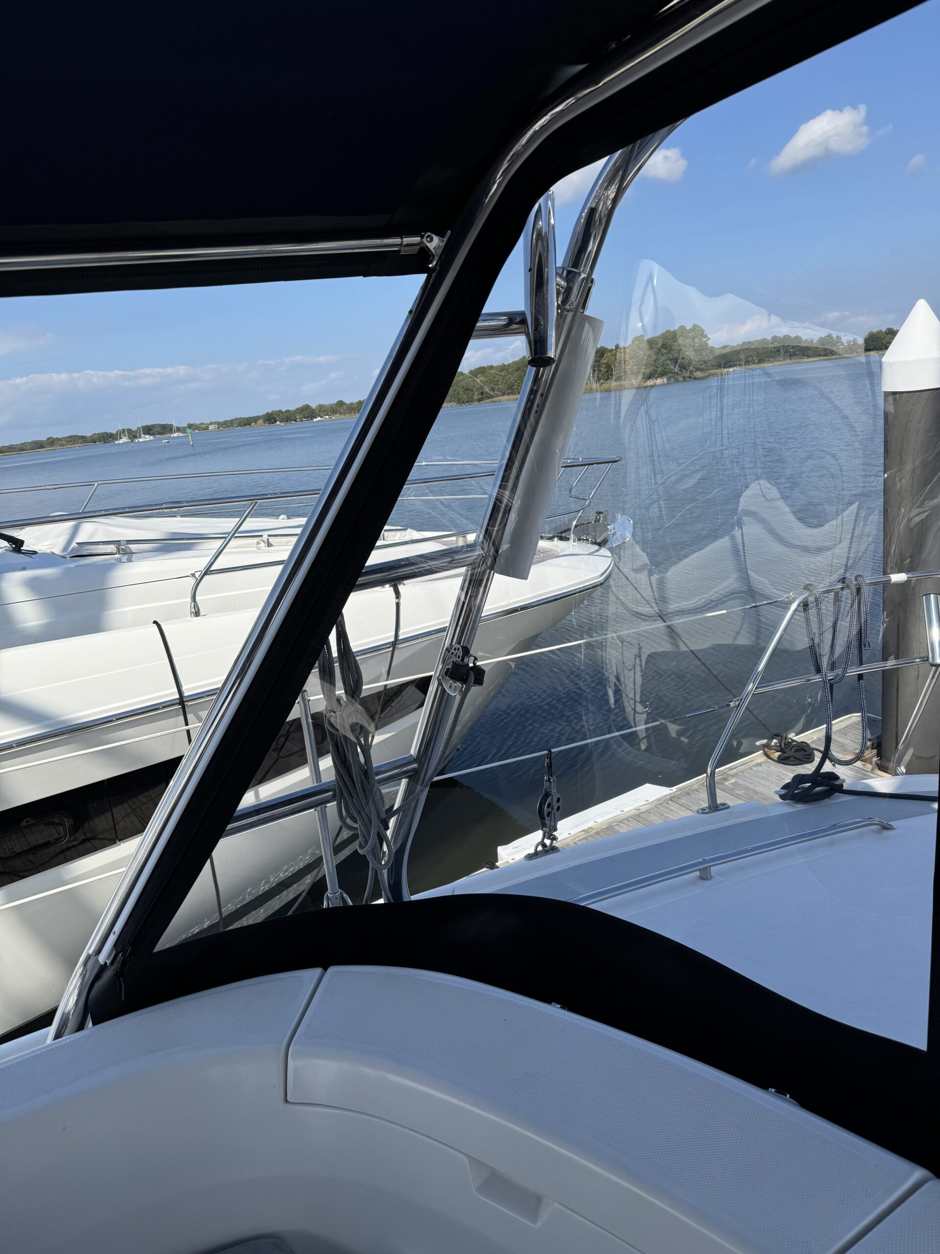 The enclosure presented its own unique challenges beginning with the large aft arch support, a notorious not so friendly Hunter boat feature to work around. In addition to the large arch, side “bump outs” to house winches also presented a challenge for a smooth side panel fitting. This enclosure consists of 7 panels, 2 each side and 3 in aft. The customer uses the side curtains all season long but only the aft panels during early and late season in cooler temps. Track was installed along the arch to support the aft panels keeping them independent from the side panels. This allowed the opportunity to create wings on the side panels extending them further aft. The wings are not only an aesthetic design feature, it also provides additional protection for the aft cockpit seating when the aft curtains are not in use. Custom grab rails spanning the full length of the bimini were installed giving a very sturdy hand hold support while traversing aft and forward without worry while under way.