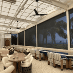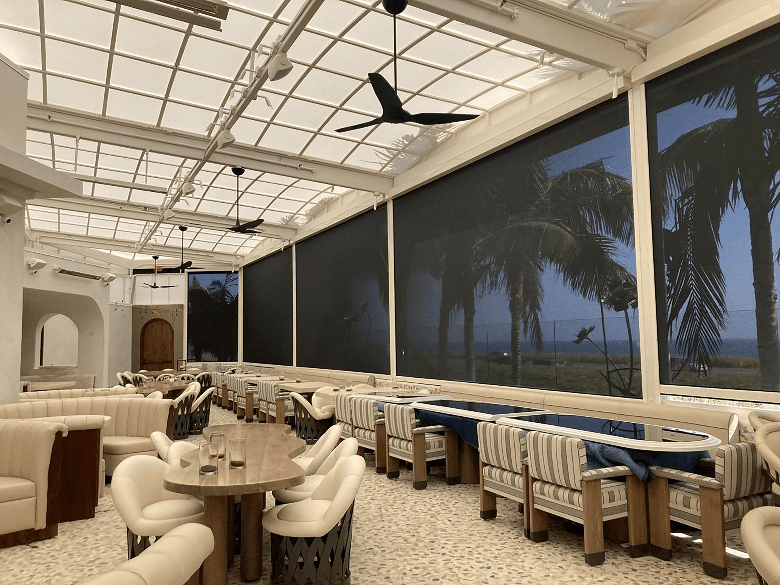 Not just a restaurant, but an elevated dining experience—Javier’s Cantina is a high-end Mexican eatery with a stunning view of the Pacific Coast. The client sought a shade solution that harmonizes with their elevated ambience, maintains the charming coastal view, and provides a break from the sun, particularly during dinner hours. The resulting design—a 9-screen motorized system made of Twitchell’s Nano 95 line—offers essential sun protection without sacrificing the ocean view, which is beloved by new and returning customers.