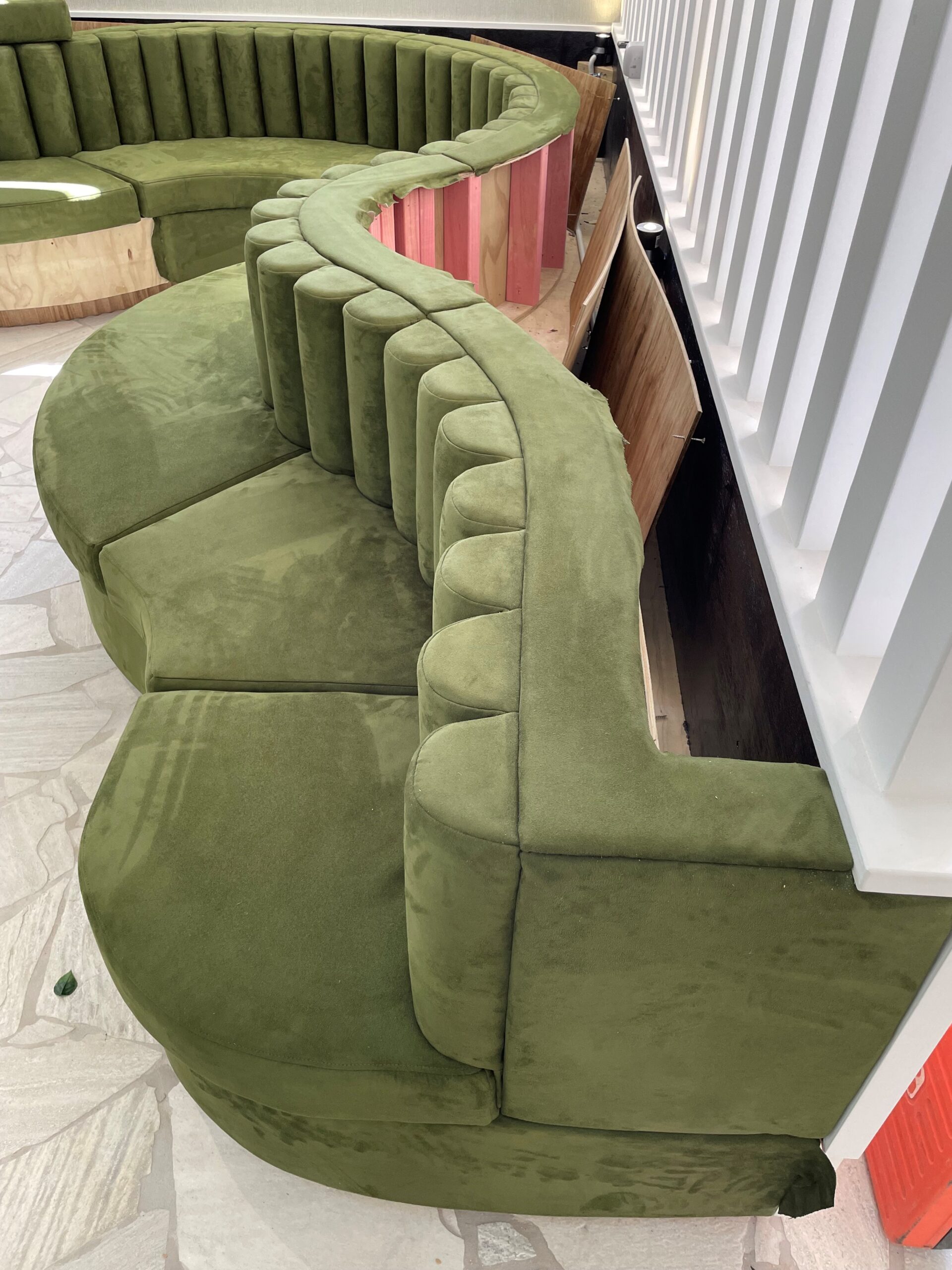 Midway through, the design changed significantly, with final approval granted on the third iteration. The new vision introduced a major technical challenge: integrating 98 individual bolsters into the booth design to deliver a refined, detailed finish. This required a ground-up rethink of our manufacturing approach.