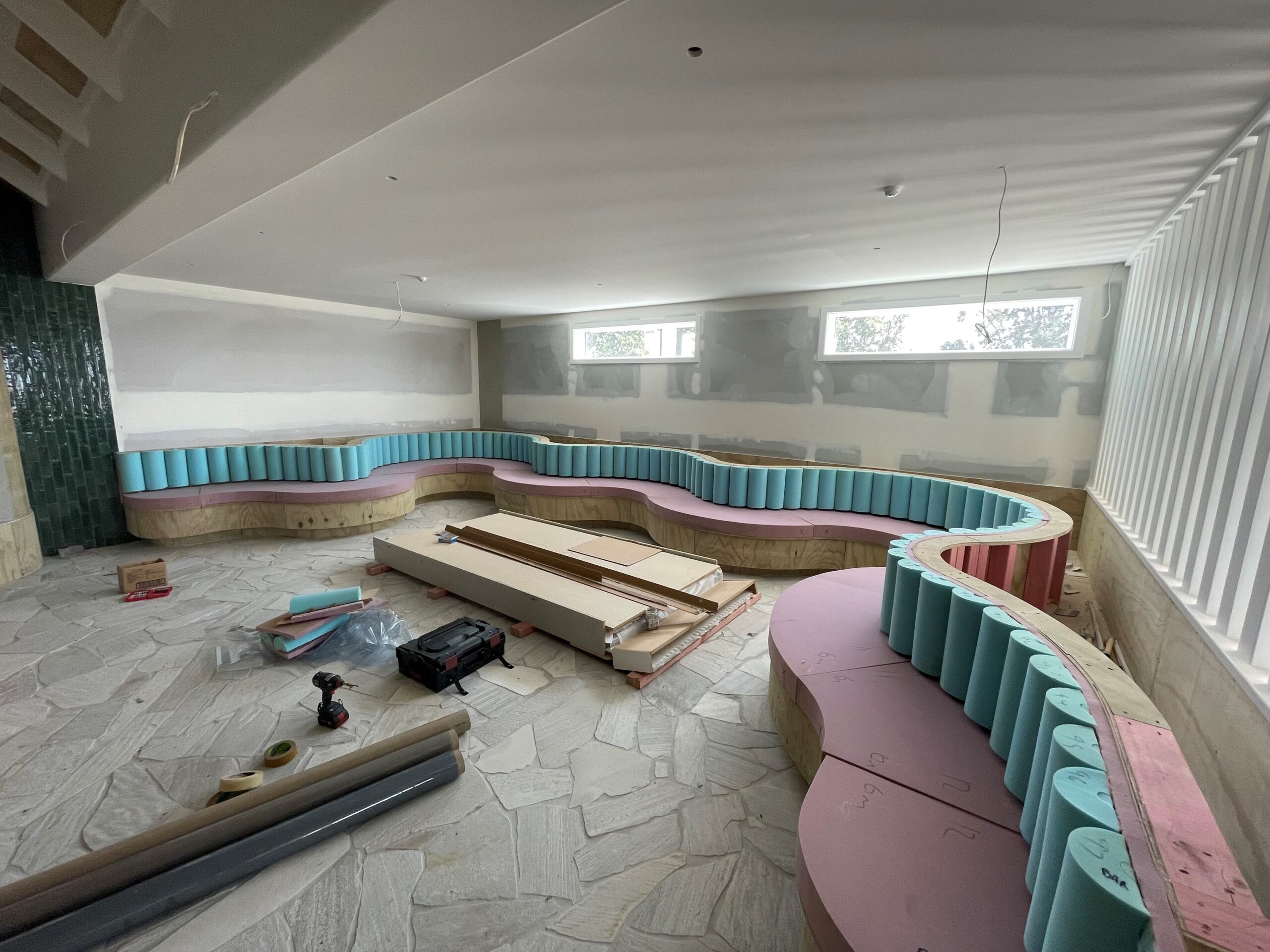 Timeframe - Because of the unique and customised design we had to pattern elements of the seating on site, return to manufacture, then return to the site for installation—ensuring exacting detail and finish. We had to have this all completed before opening day and as other trades overran, we had to wait until they were finished before we could install.