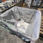 Our challenge was to innovate a cover out of a 2nd hand banner mesh that was still able to retain its integrity and keep 100s of paint pails contained in their recycling transport process.