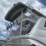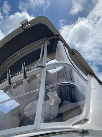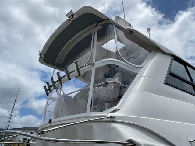 We undertook this project to design and construct an extended flybridge canopy. This addition significantly improved weather protection while enhancing both functionality and style. The extended canopy offers increased shade and UV protection, better use of available space on the flybridge, and superior all-weather usability. Tailored to a tall client, the canopy also provided extra overhead clearance for added comfort. Paired with custom Vybak panels, the purpose-built canopy showcases our commitment to innovation and bespoke craftsmanship on a vessel rarely seen with such a modification.