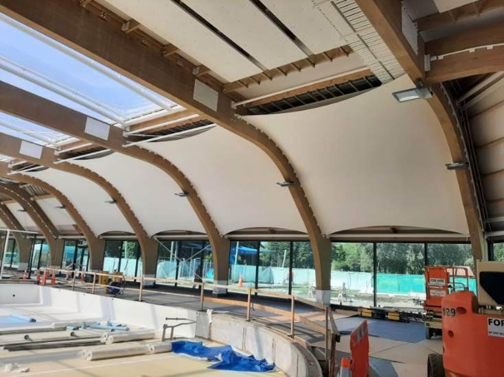 We were asked to design, engineer and build an internal acoustic ceiling to be positioned mostly around the pools edge, to compliment the main roof above the pool which was a new ETFE membrane, recently installed in an existing community aquatic centre.