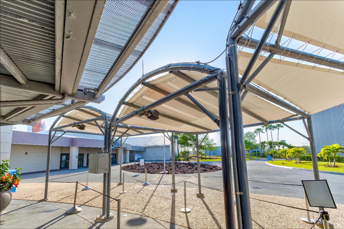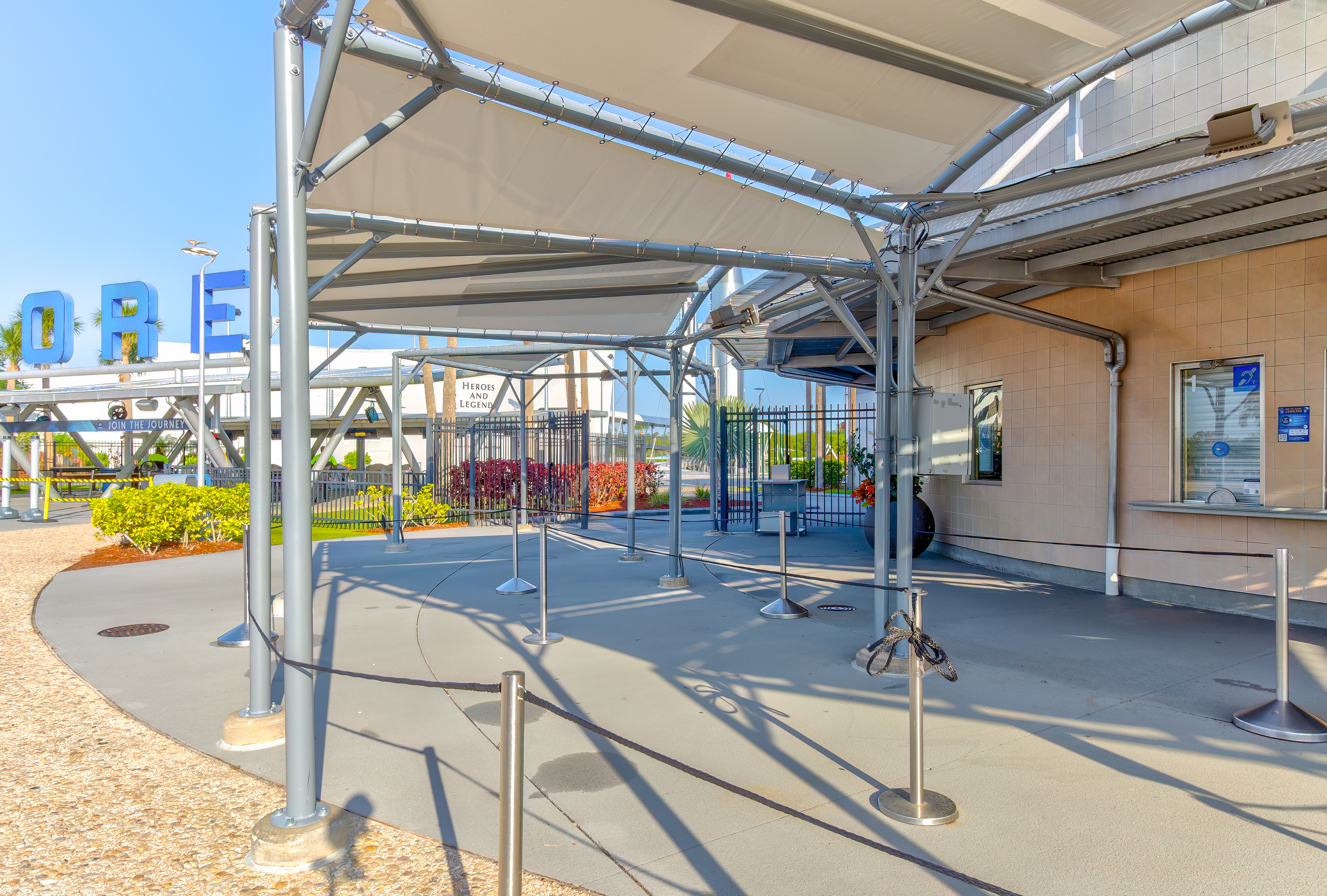 This project involved the design, fabrication and installation of five Quad Pole Solar Sail Canopies for the front entrance of the NASA Kennedy Space Center’s Will Call ticket center. Positioned where visitors queue for tickets, these freestanding structures provide essential shade and relief from the Florida sun while guests await entry to one of the world’s most iconic space exploration facilities.