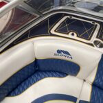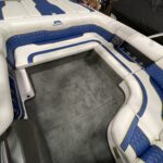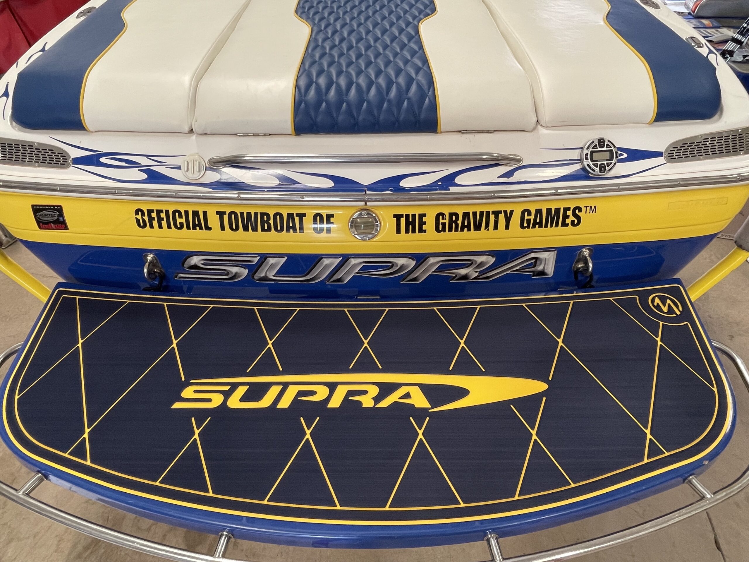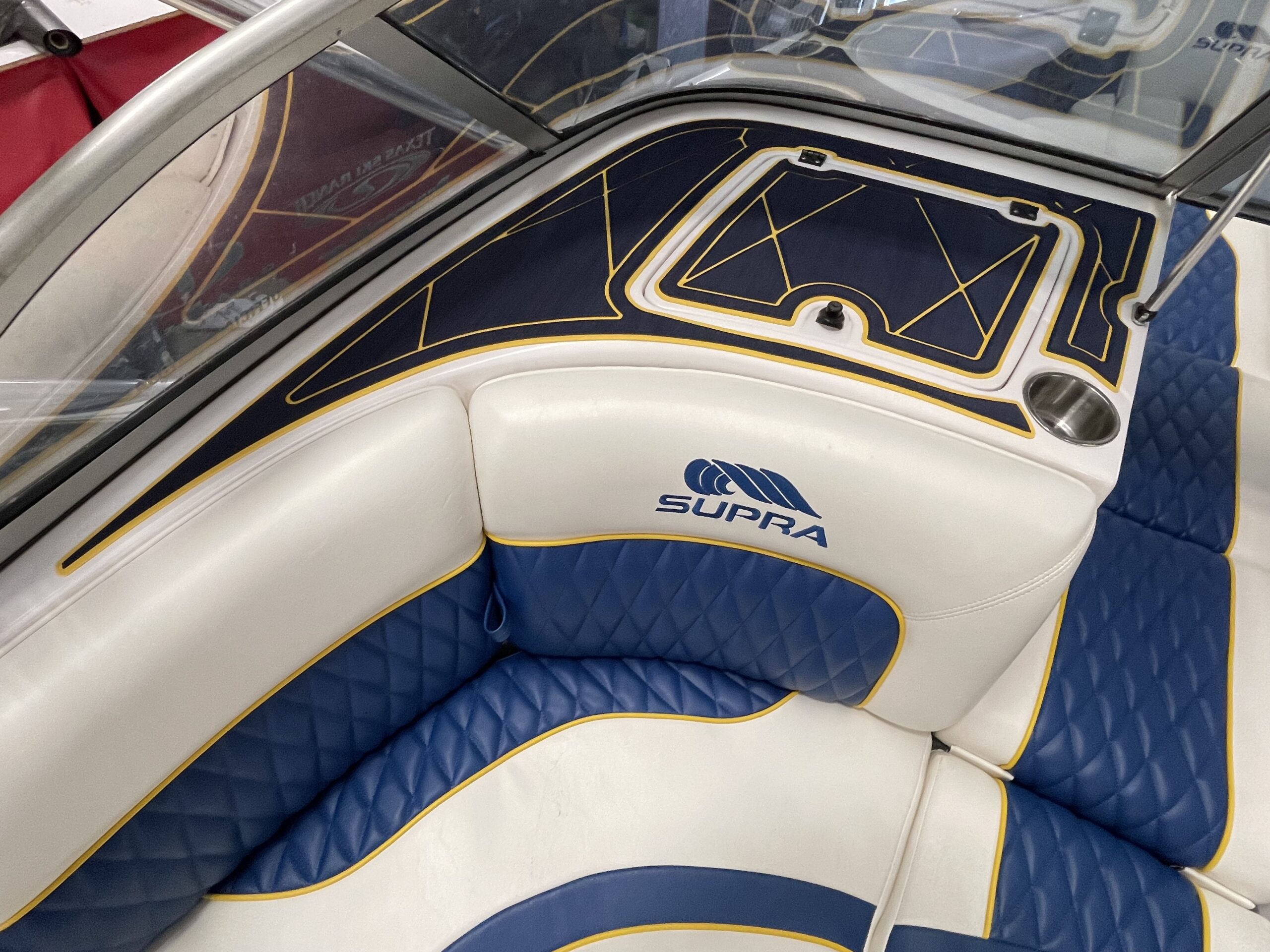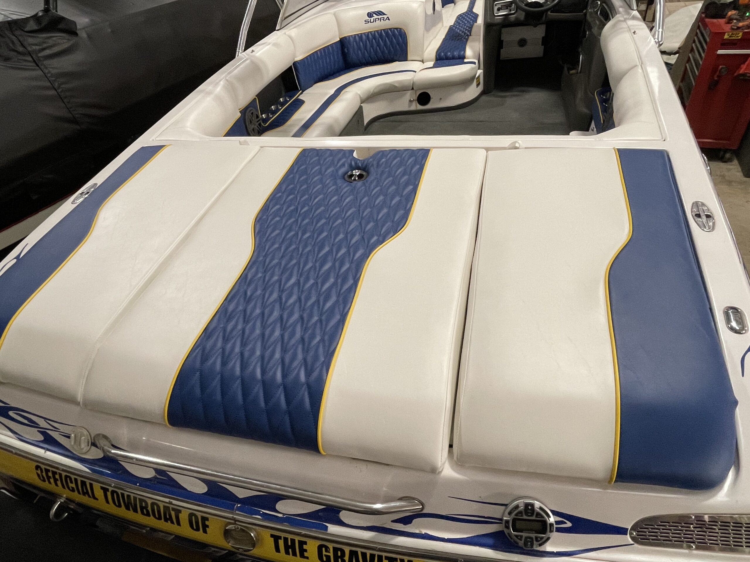 We had to enter this project just because of the splash of flash. This customers motto is "the flashier the better." The boat was already bright to begin with. It's yellow, white with blue accent flames everywhere. But the seats, swim deck, carpet were lacking razzmatazz. I know, when was the last time you saw razzmatazz spelled out? Twice eve? So with clear direction we started tearing into the interior. Shame on Supra because they bolted half the interior seats in before they mounted the hulls together. So we had to pull out all of our tricks to get the bow cushions out and we had to be even more creative to mount them back on. With the new seat design, new carpet, blue and yellow Marine Mat, I think you can see this flash of a boat from space. The customer just loved it and of course got a lot of attention this summer on the water.